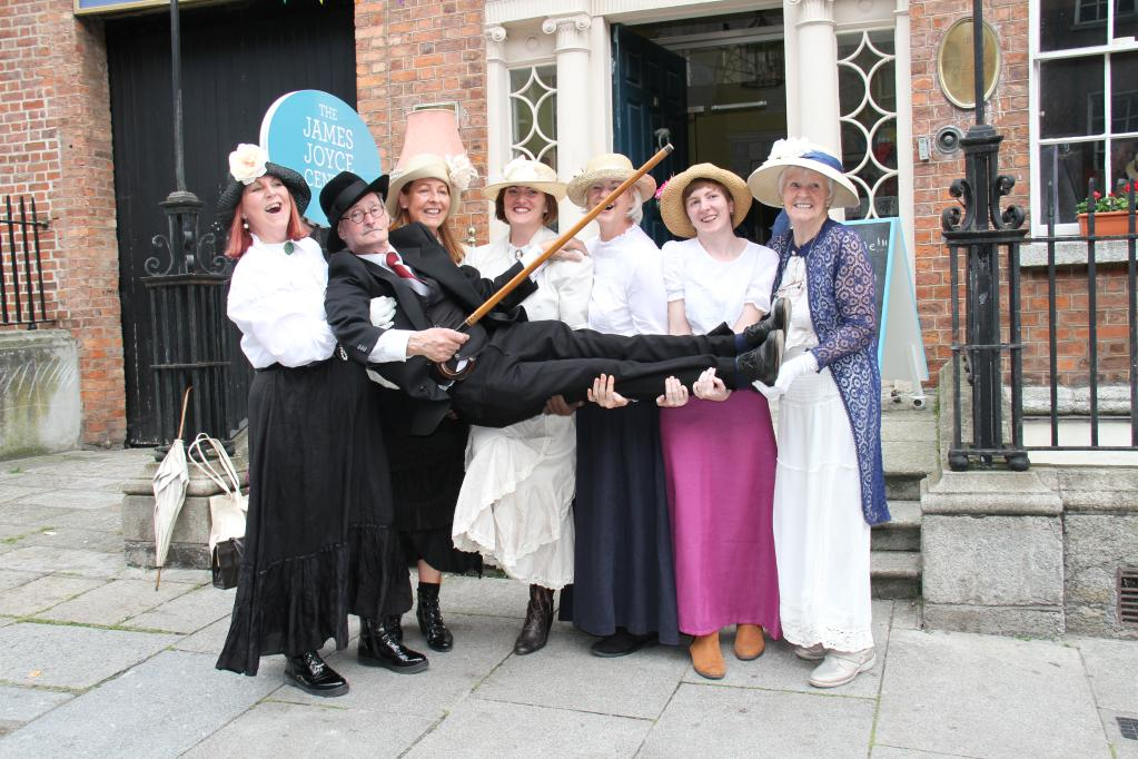 6月16日,在爱尔兰首都都柏林,人们在街头举办的纪念《尤利西斯》出版100周年的活动上合影。