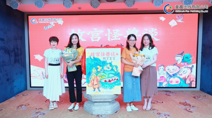 童趣出版有限公司总经理史妍(左一)、作者常怡(左二)、插画作者谭诺(左三)、童趣出版有限公司总编辑刘玉一(右一)为《故宫怪兽谈》揭幕。
