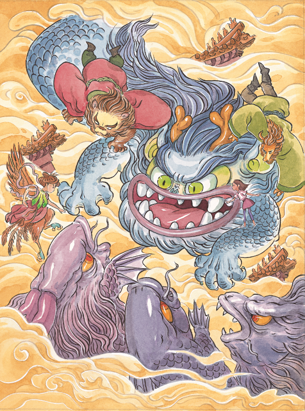 同时,插画师谭诺为《故宫怪兽谈》创作的百余幅作品。这些插画采用水彩手绘的方式,流畅的线条和丰富的色彩间,流淌着插画师对传统文化、对怪兽的热爱,对儿童心理和视觉特点细致入微的体察,也蕴蓄着插画师天马行空的想象力。