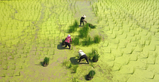 8月7日,广西贺州,平桂区鹅塘镇丹村村民在立秋当日栽种马蹄(荸荠)。视觉中国供图