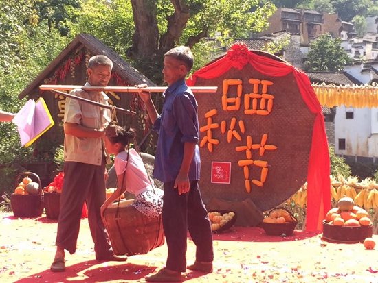 袁瑾在《二十四节气在江南》一书中记录了安徽婺源篁岭古村落立秋举行“晒秋节”的情景:“晒秋节上,村民们将果物菜蔬铺在圆圆的晒匾内,搁在晒架上,融入阳光中。红的辣椒、金的皇菊花、黄的玉米、酱色的干菜、绿油油的油茶果等等,在蔚蓝天际的帷幕中,一直向山脚延伸下去,与白墙、黛瓦组合在一起,仿佛一幅挂在山间的油画,色彩浓郁得化不开。”
