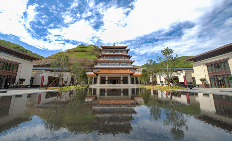 文瀚阁是建筑群的制高点,坐落在台基之上,借鉴敦煌莫高窟九层楼的神韵,让建筑如殿堂般典雅庄重,似礼器般谦逊仁和。