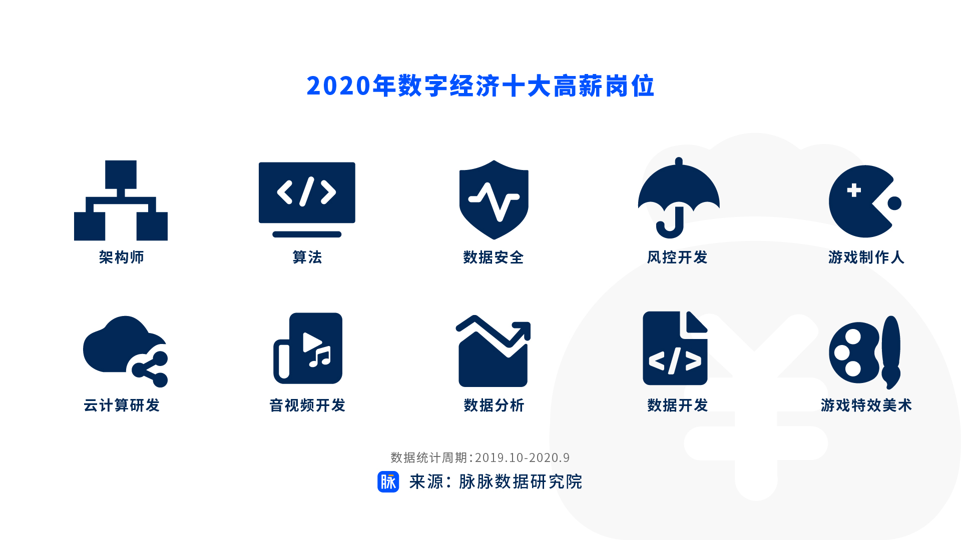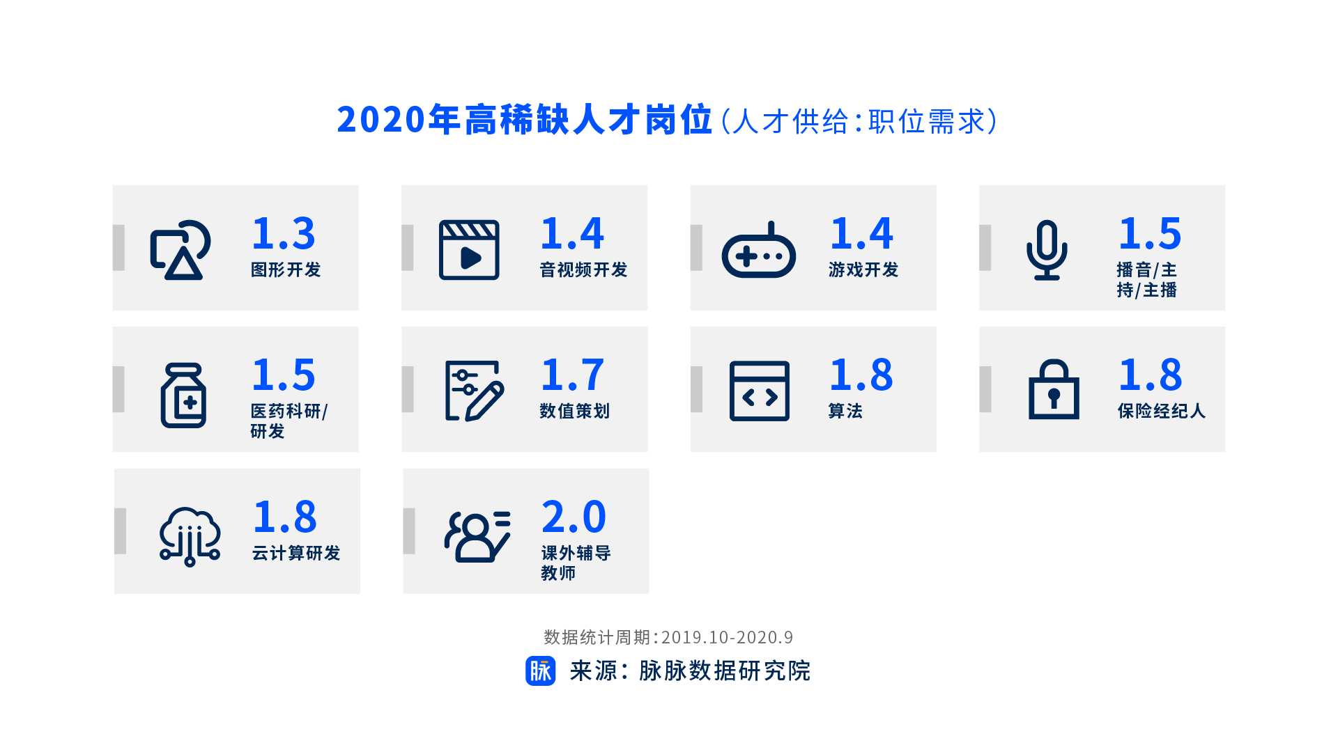诸多行业流动和职业选择背后,均指向了一个概念:数字经济。2020年人才稀缺度排名前十的岗位:算法、云计算等高精尖人才入列,音视频娱乐产业的发展,使得图形音视频开发等十分抢手,而主播和课外辅导教师在2020年变得格外紧俏,分别印证了直播和在线教育的兴起。