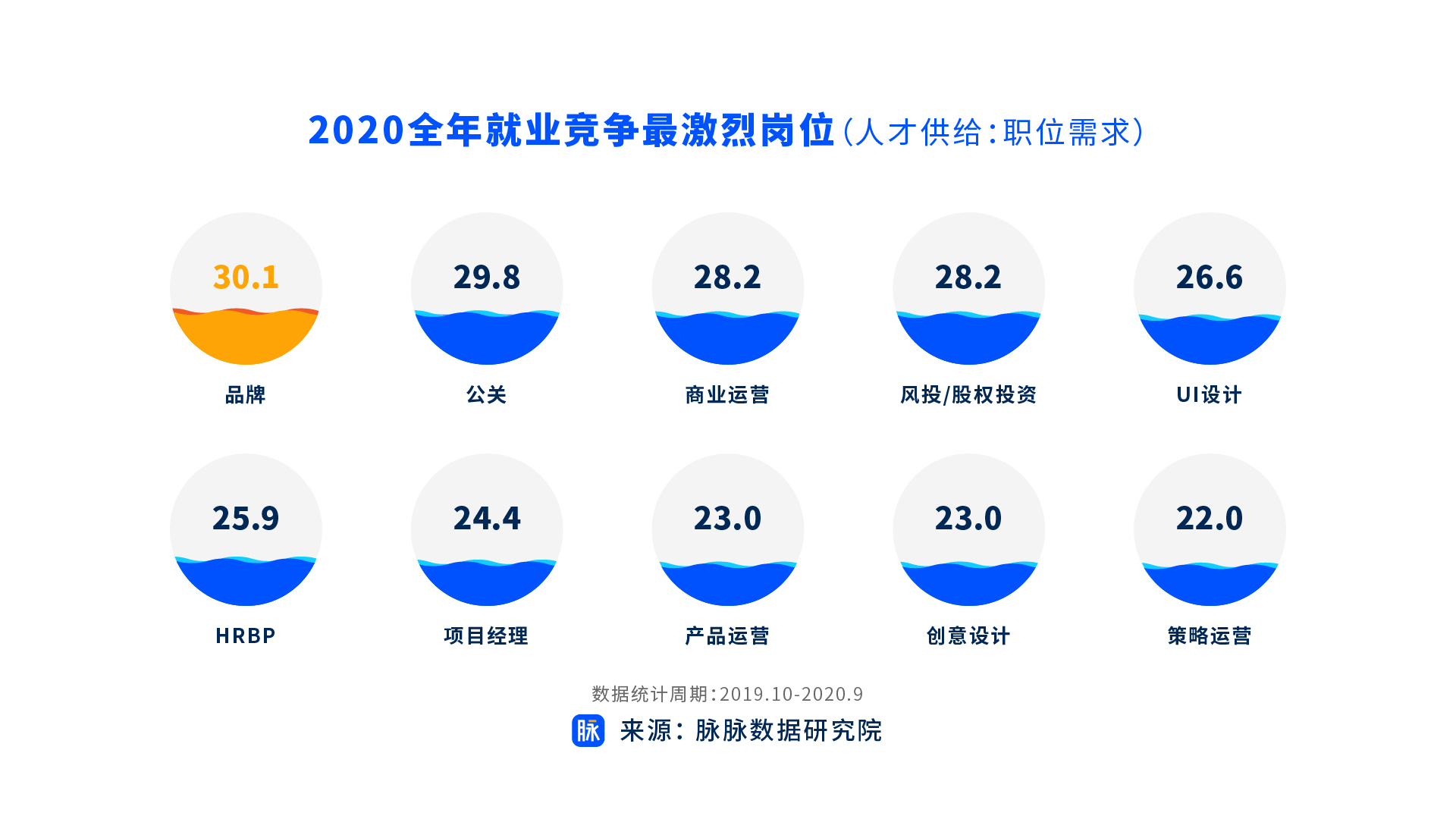 报告里披露的2020年全年就业竞争最激烈的岗位,大都是那些已经成熟且标准化的岗位,比如品牌、公关等。