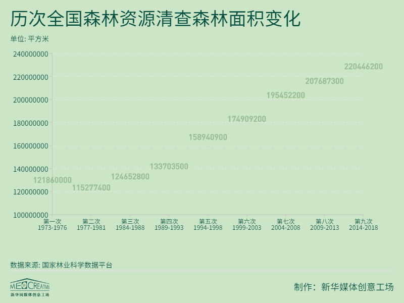 从1973年到2018年,在45年时间里,全国森林面积增长了98586200平方米,相当于增加了约13808个标准足球场的面积。