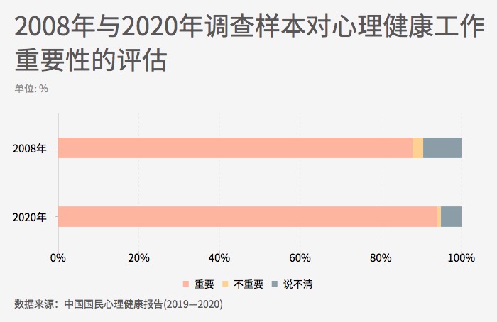 心理健康意识体现为认识到心理健康工作的重要性。对于心理健康工作重要性的评估,2020年调查中,有94.0%的调查对象认为心理健康工作是重要的。与2008年相比,2020年调查中,有更多的人认为心理健康工作重要,比12年前提高了6.1个百分点,说明人们的心理健康意识有所增强。