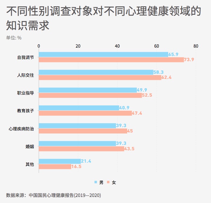 2020年调查询问人们需要哪些方面的心理健康知识,并分析不同群体的需求特征。数据显示,“自我调节”、“人际交往”、“职业指导”位列选择的前三。另外,女性在各项心理健康知识的需求上的选中率均高于男性,提示着女性对心理健康知识有更主动和迫切的需求。