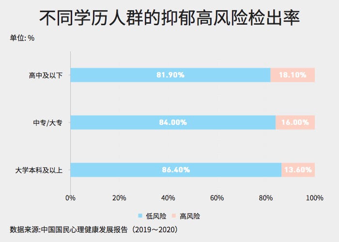根据报告分析结果显示,不同学历组间差异显著。学历越高,心理健康水平越高,特别是大学本科及以上学历人群的心理健康水平显著高于更低学历的人群。以抑郁为例,可以看到大学本科及以上学历组的抑郁高风险检出率较低。