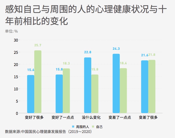 十年变迁感知调查对象认为,与十年前相比,周围的人的心理健康状况变好(“变好了很多”和“变好了一点点”)的比例为31.4%,认为“没什么变化”的占22.8%,认为变差(“变差了一点点”和“变差了很多”)的占45.9%。总的来说,人们在看待身边他人状况的时候,认为总体心理健康水平比十年前有所下降。