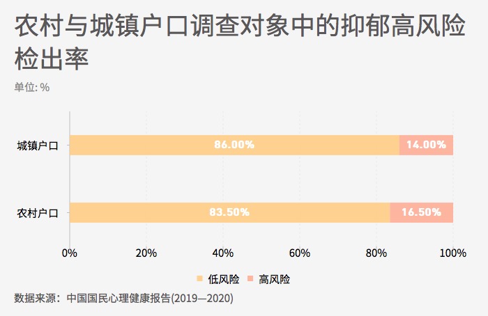 国内外研究普遍发现,社会经济地位通常与心理健康水平呈正相关。较高的收入水平、较高的学历、声望较好的职业,往往意味着拥有包括心理健康资源在内的各种资源支持,有助于维护更高的心理健康水平。研究也发现,农村户口人群与城镇户口人群之间存在心理健康水平差异。调查中发现农村户口人群中抑郁高风险的检出率略高于城镇户口人群。