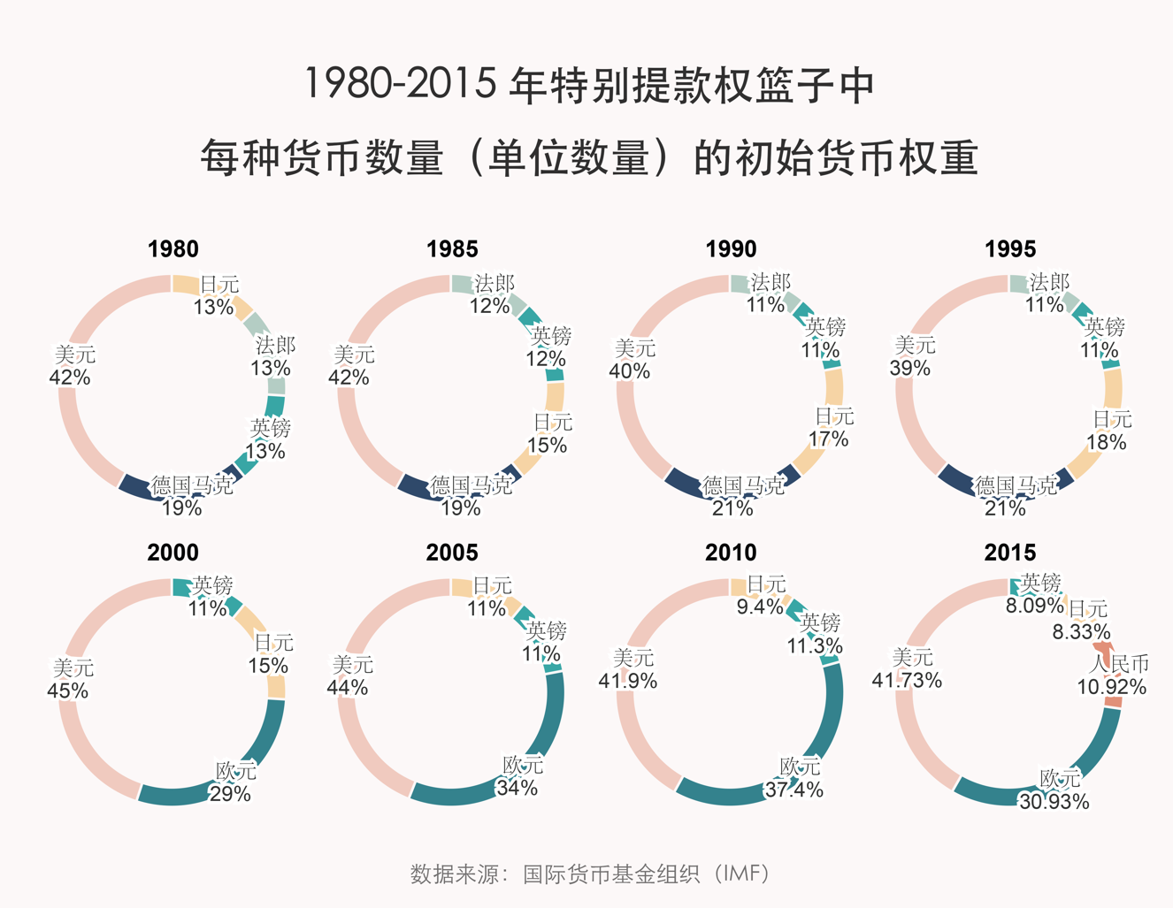特别提款权(SDR)也是我国总储备的另一大新兴“力量”。每隔五年,国际货币基金组织对特别提款权货币篮子的构成进行一次例行审查,对每种储备货币的权重加以修订。