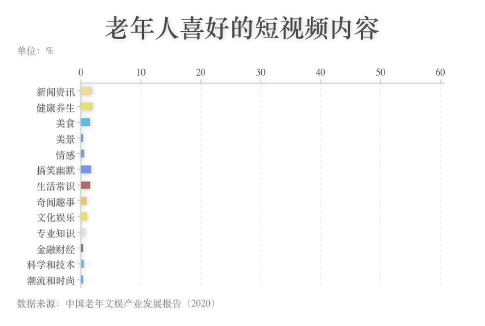 老年人群喜欢的短视频内容具有明显的年代特征和生活气息。健康养生、新闻资讯、搞笑幽默的内容是很多老年群体首选观看的短视频内容;其次,关于生活常识和美食的内容也很受欢迎,历经风霜的老年人群依旧喜好人间烟火味儿。