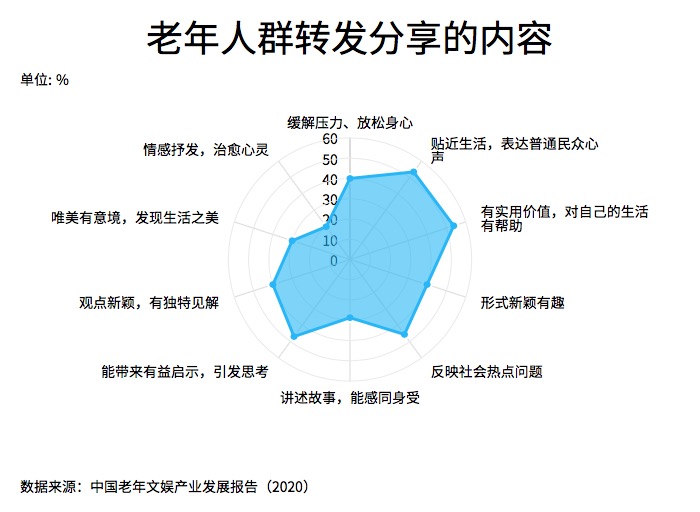 中老年人群分享的内容多是与实际生活密切相关,而且有价值的。“有实用价值,对自己的生活有帮助”的内容占53.8%,“贴近生活,表达普通民众心声”的内容占53.4%,“能带来有益启示,引发思考”的内容占47.2%,“反映社会热点问题”的内容占45.7%。