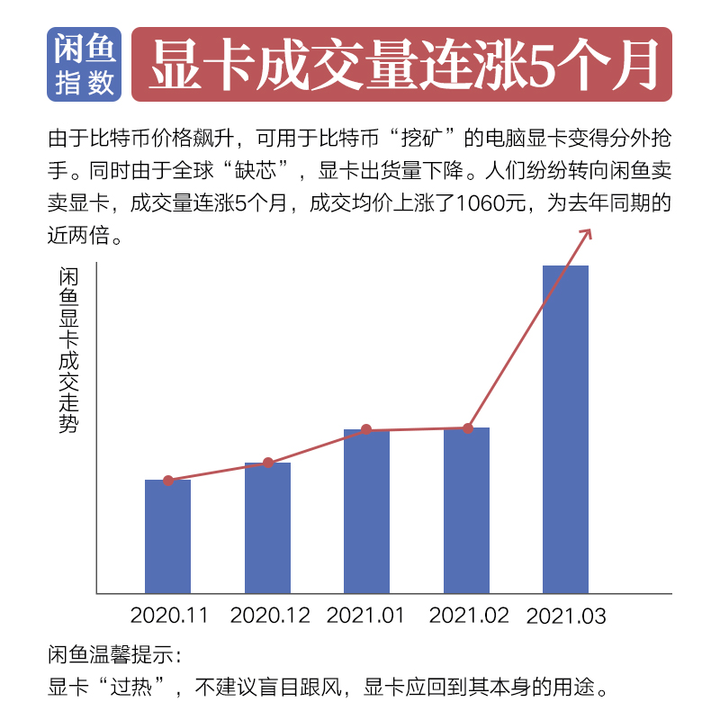 根据闲鱼平台数据显示,显卡成交呈现明显的“量价齐升”现象。闲鱼平台上显卡的成交量已经连涨5个月,仅在今年第一季度,显卡成交量同比增长了338%,3月份更是呈飙升走势。对此,平台将设置“冷静期”进行降温处理,并呼吁用户理性购买。