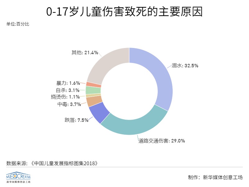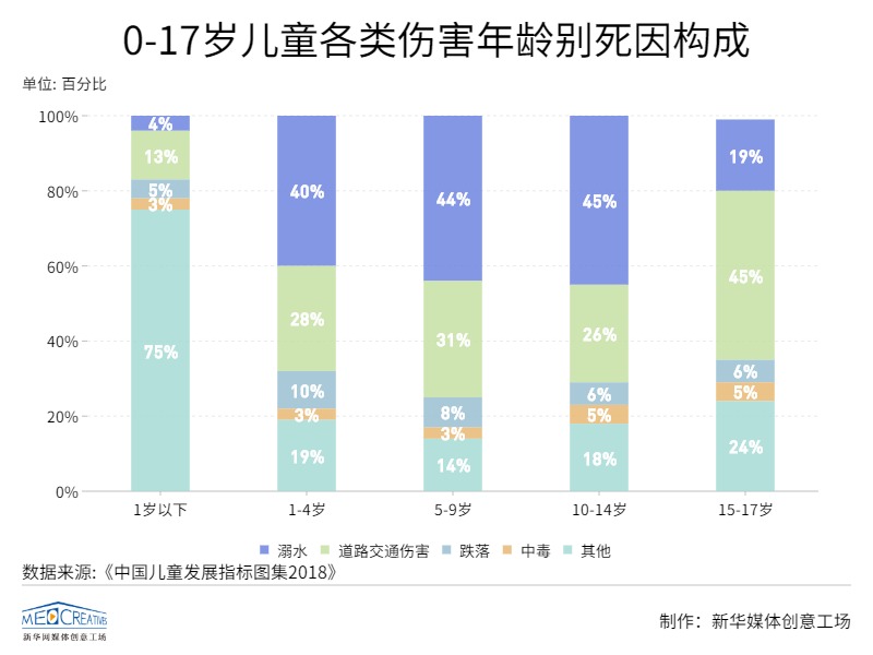 《2018中国儿童发展指标图集》显示,溺水已成我国0-17岁青少年儿童伤害致死的首要原因,占儿童伤害死亡的32.5%;道路交通伤害是0-17岁儿童伤害致死的第二大主要原因,占儿童伤害死亡的29.0%。