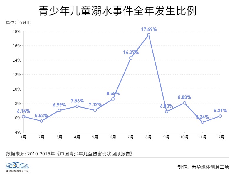 根据2010年-2015年《中国青少年儿童伤害现状回顾报告》,青少年儿童伤害事件多发生于7月和8月,其中8月份溺水案例占比最高,占全年溺水案例的17.49%。
