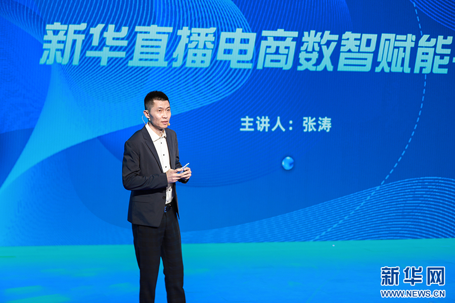 新华炫闻(北京)移动传媒科技有限公司常务副总裁、新华网数字经济事业中心负责人张涛上台推介“新华直播电商数智赋能平台”。新华网 陈延特摄