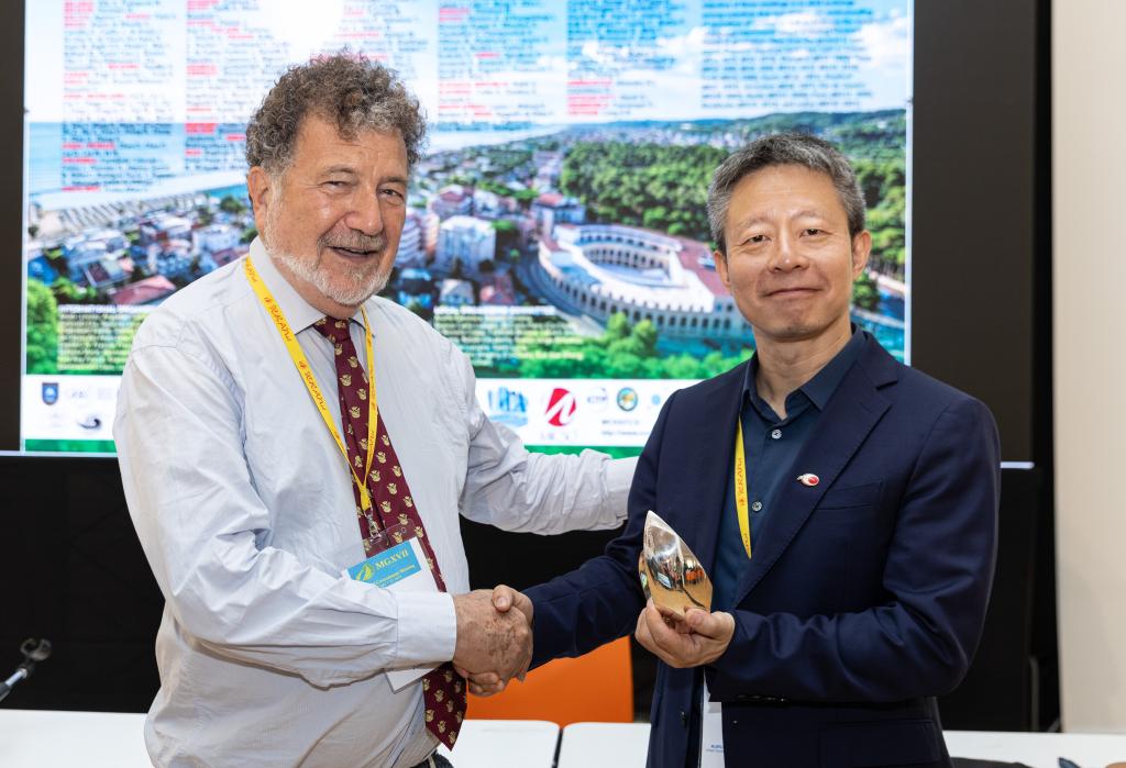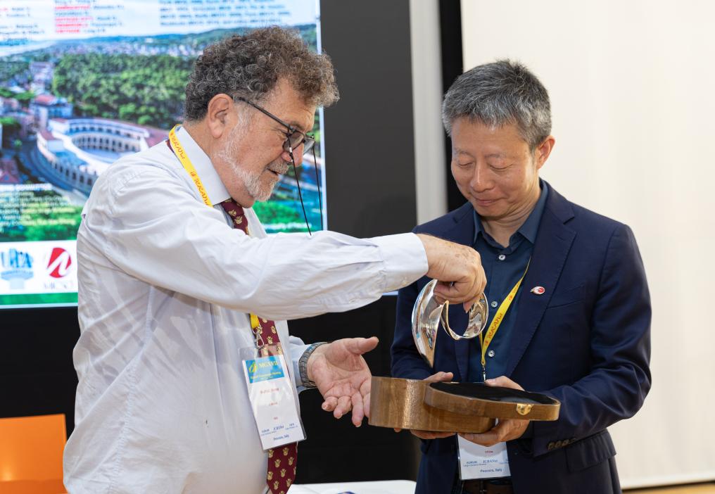 7月9日,在意大利佩斯卡拉,会议主办方之一、国际相对论天体物理中心网络主任雷莫·鲁菲尼(左)为李菂颁奖。