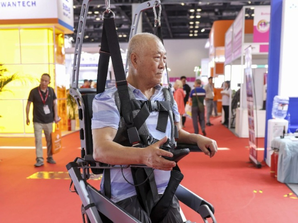 5月21日,2024第十届中国国际养老服务业博览会在北京举行。图为参观者试用一款智能行走机器人