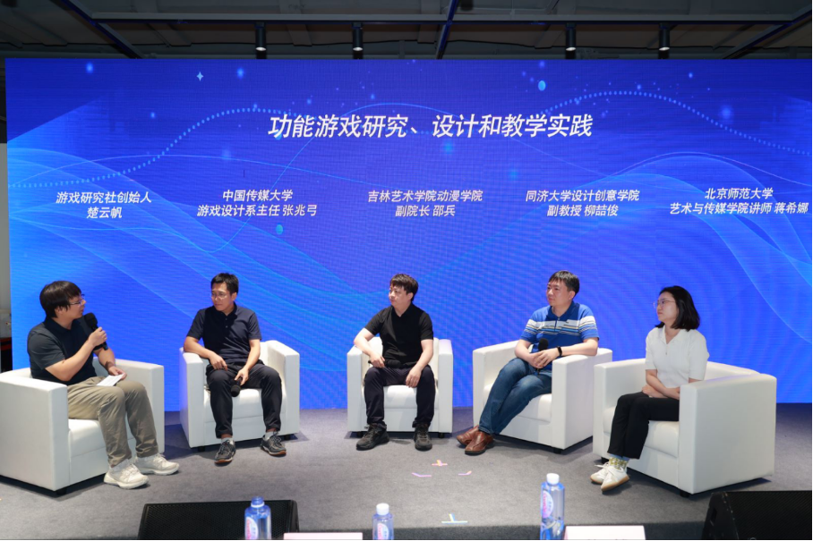 圆桌论坛围绕“功能游戏设计、研究和教学”主题展开,吉林艺术学院动漫学院副院长邵兵、中国传媒大学游戏设计系主任张兆弓、同济大学设计创意学院副教授柳喆俊、北京师范大学艺术与传媒学院讲师蒋希娜分别分享了对功能游戏研究和教学的看法。游研社创始人楚云帆担任主持人。