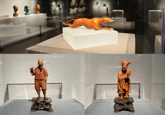 严德晖黄杨木雕作品,分别为《灰色猎犬》《渔夫》《济公》。黄杨木雕作为传统民间工艺,承载着深厚的文化积淀。