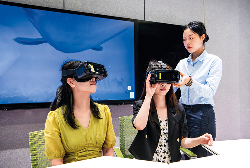 在网龙网络公司的中国福建VR体验中心,两名参观者在体验VR“智慧教室”(2024年7月18日摄) 魏培全摄/本刊