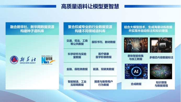 平台的高质量语料库服务,汇聚了包括新华社、新华网数据在内的各类权威专业的行业数据,以及AIGC标注数据、合成数据,有效解决垂直领域模型训练数据资源的语量和质量瓶颈。