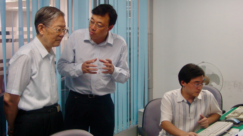 周光召(左)在“星光中国芯工程”实验室听取邓中翰(中)汇报工作。