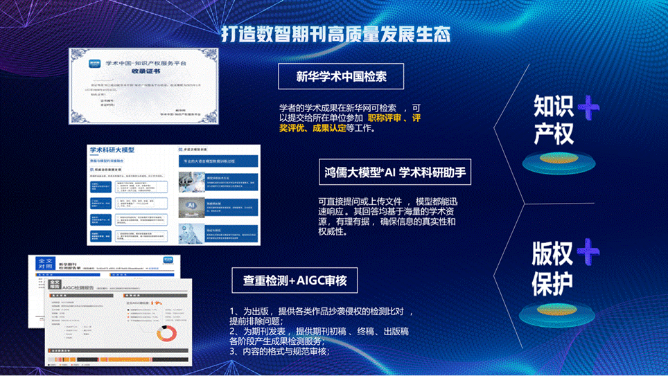 据了解,新华网“学术中国-知识产权服务平台”(以下简称“学术中国”)通过不定期举办相关专业领域主题活动,旨在搭建专业化、高规格、权威性交流平台,促进出版、期刊、科研、高校等行业开阔思路、取长补短、广泛合作。7月首次举办的相关期刊研讨会,在业内得到广泛认可和参与。截至目前,平台已陆续与2000余家出版社及期刊单位达成合作,获得授权进行版权运营服务,并为合作单位提供学术查重、AIGC检测、文献解读等新华AI服务方案。