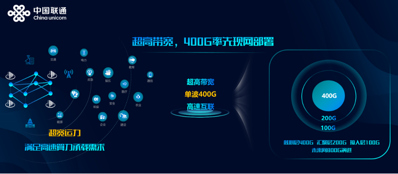 上海联通构建面向算力时代的超宽运力网络。升级400G全光传送网,较100G运力,带宽容量提升3倍,单纤传输容量达24T,满足算力数据中心间单波400G运力调度、200G跨汇聚、100G直驱用户接入。