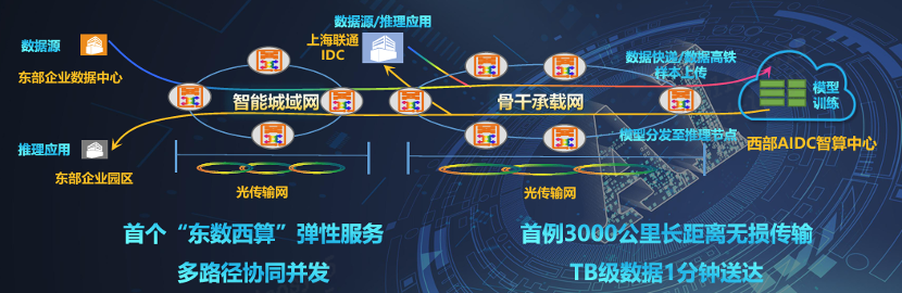 今年5月,上海联通完成了“上海-宁夏”实际传输距离超3000公里的海量数据广域高通量无损传输验证。基于中国联通覆盖全国的骨干全光ROADM网络和169骨干互联网,面向上海智算业务训练数据导入宁夏中卫智算训练集群的典型“东数西算”场景,开展“IPv6+”、新型传输层协议、长距RDMA无损传输、端网协同传输等网络创新能力验证,实际传输线路长度超过3000公里。解决智算与超算业务场景下TB级海量数据高效、无损、低成本传输业界难题。