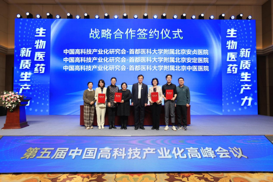 会议期间中国高科技产业化研究会与首都医科大学附属北京安贞医院、北京安定医院、北京中医医院签署了战略合作框架,并正式授予三家医疗机构“中国高科技产业化研究会医药成果转化示范单位”称号。未来将携手共进,共同助力医药成果转化进入一个全新的“加速度”时代。