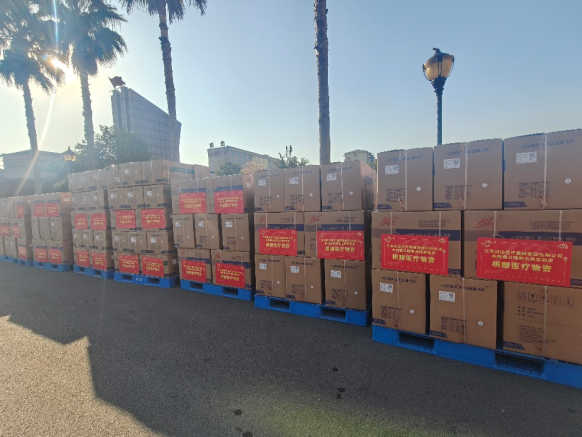 1月10日,在洪达集团的捐赠现场,整齐摆放的救灾医疗物资正陆续装车,准备发往西藏灾区。