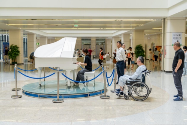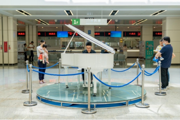 门诊大厅中央,一架钢琴静静伫立,有音乐特长的患者、家属和志愿者,时常在往来人潮之中弹奏安然宁静的旋律,音乐,这一历久弥新的治愈良方,在此发挥着独特作用,帮助人们放松心情,调解情绪。