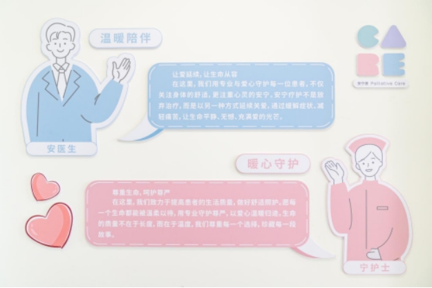 梁先生(化名)确诊肝内胆管癌晚期,病情进展恶化,当生命步入终章,安宁疗护成为了最后的温暖守护。医护人员帮助他减轻痛苦和不适症状,给予他身体、心理、社会和精神层面的支持。最后时刻,挚友、亲朋围在病床旁,一起举起了手中的啤酒,轻轻送别这最后一程;罹患肺癌的张先生,临终前最后的心愿是和妻子、儿子一起拍张全家福。肿瘤科通过VR技术,使他的遗憾得以圆满……这几位患者人生故事的缩影,也是医院安宁疗护践行“道谢、道歉、道爱、道别”的“四道人生”理念的一个缩影。在安宁居,家庭式布局的病房,营造着“家”的归属感;设计充满亲和力的“安医生与宁护士”卡通IP形象,传递关怀,缓解患者和家属面对病痛的紧张和恐惧;倾听“生命故事”,了解患者的需求,建立有效、良性的医患沟通;通过安宁疗护,为临终患者及其家属提供身心照护与情感支持,让生命的最后阶段充满温暖与意义。