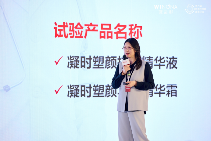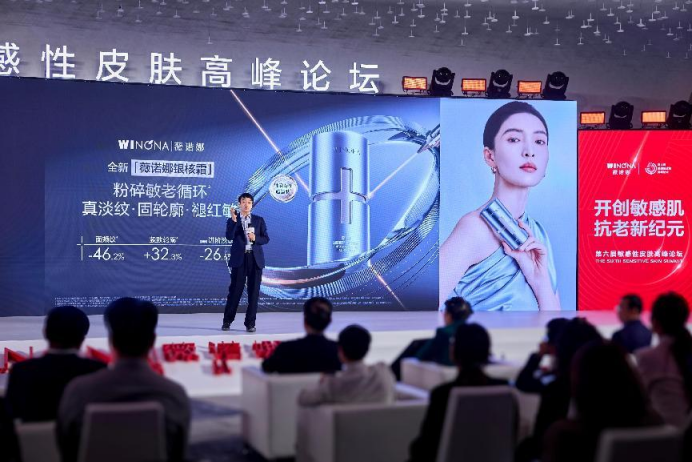 此外,上海市皮肤病医院皮肤与化妆品研究室常务副主任谈益妹分享的《敏感性皮肤抗老产品临床研究成果报告》,用真实的数据为敏感肌抗老产品的有效性与安全性背书。据谈益妹主任介绍,在上海市皮肤医院进行了一项薇诺娜银核CP用于不同年龄段敏感性皮肤人群、分龄分组(26-35岁组、36-45岁组、46-55岁组)设计、随机、半脸对照的临床试验。结果显示连续8周使用薇诺娜银核CP后,不同年龄段人群均获显著改善:26-35岁组肤色提亮、泛红缓解,皮肤屏障功能增强;36-45岁组和46-55岁组的鱼尾纹、泛红面积缩小,皮肤含水量提升,经皮失水率下降,皱纹、毛孔、肤色均有改善。对比市面国际知名抗老产品,该组合在皱纹改善、肤色提亮及屏障修护上表现更优。薇诺娜银核CP,在兼顾舒缓跟修护效果的同时,也满足了不同年龄段敏感性人群的抗老化的需求,也为敏感性皮肤消费者抗老提供了更好的一个选择。”