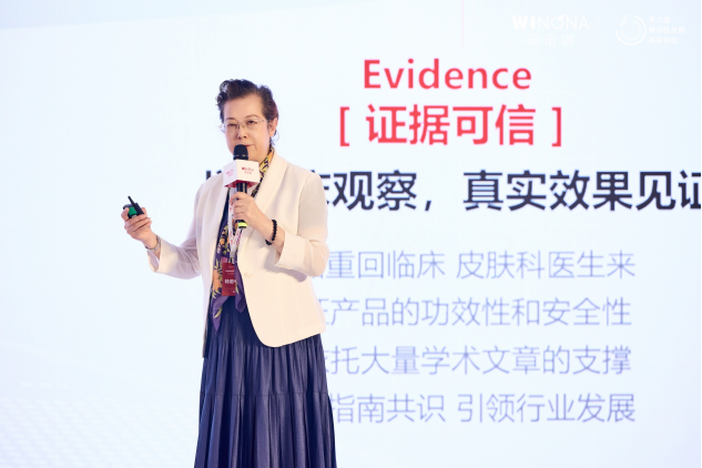 在主题演讲环节,昆明医科大学第一附属医院、国家教育部创新团队带头人、亚太皮肤屏障研究会副主席何黎教授以《遵循NUTE原则·推进敏感性皮肤抗老护肤品高质量发展》为题,首次系统披露了敏感肌抗老的关键机制研究成果。
