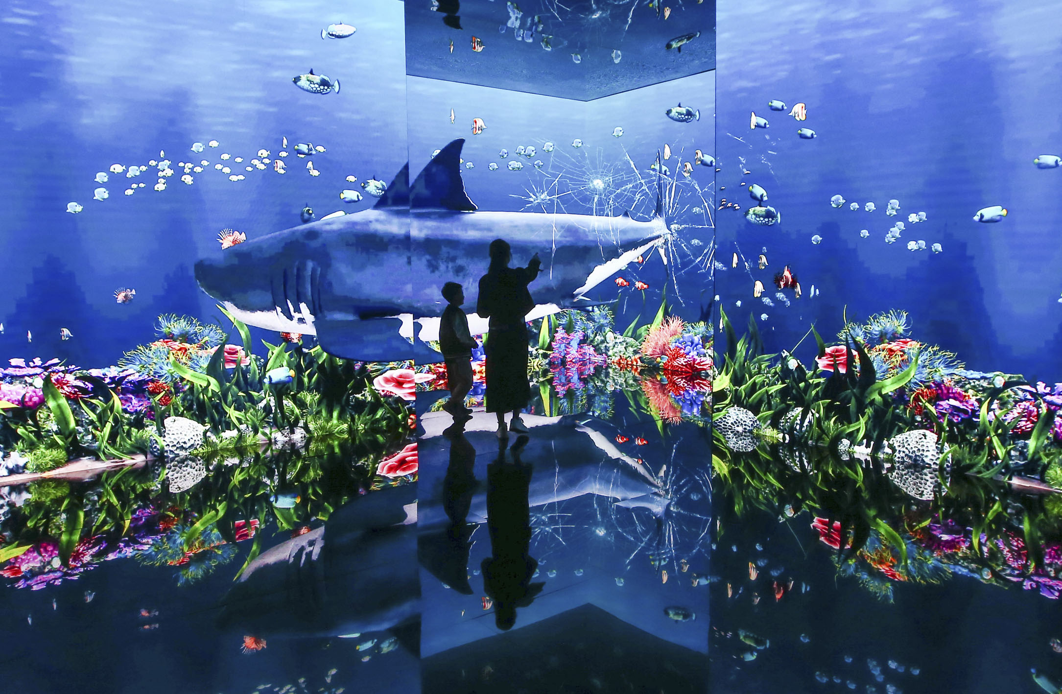 图为游客在位于济南市的山东省美术馆参观体验“无限之海”沉浸式AI数字艺术展。新华社发(郝鑫城 摄)