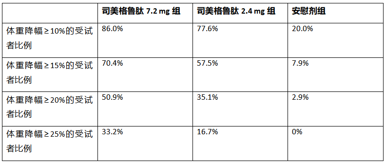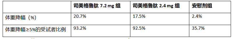 在评估治疗效果(不考虑治疗依从性)时,接受司美格鲁肽7.2 mg治疗的受试者体重降幅达18.7%,安慰剂组为3.9%;此外,90.7%的接受司美格鲁肽7.2 mg治疗的受试者体重降幅≥5%,安慰剂组为36.8%。