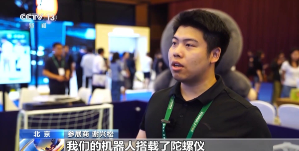参展商谢兴松:我们的机器人搭载了陀螺仪,能在运动过程中自平衡。在足球赛的激烈对抗中,可以最大限度测试人形机器人的性能极限,能在未来更好应用。
