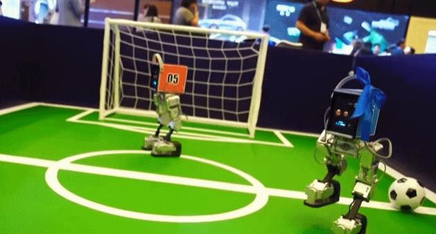 几个正在踢足球的机器人吸引了不少观众。技术人员介绍,这个机器人组合在不久前的机器人马拉松比赛中跑进了前十名,马上还要参加世界人形机器人运动会。