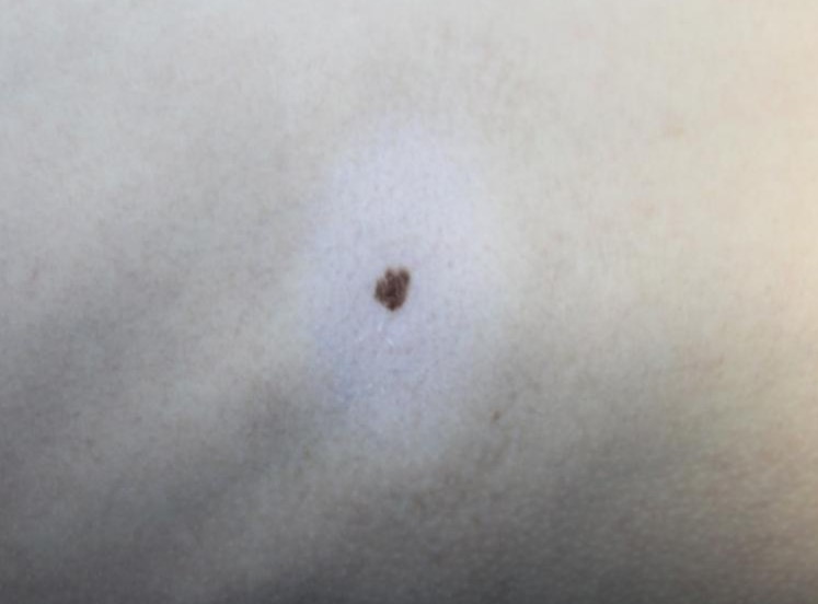 白色:晕痣,又称离心性后天性白斑。主要表现为色素痣周围出现一圈局限性色素减退斑。这些白斑通常为圆形或椭圆形,边界清晰,就像给痣戴上了一个白色的“光环”。晕痣可发生于任何年龄,但以儿童及青壮年较为多见,无明显性别差异。常见于躯干部,也可见于头面部、四肢等部位。皮损可单发,也可多发,25%~50%的病人有两个或以上的晕痣。部分晕痣具有一定的自限性,即中央痣可能在一段时间后逐渐褪色,由深褐色变为浅褐色,进而变为粉红色,最后完全消失,随后白晕也会逐渐消退。但也有一些晕痣可能会逐渐扩散,面积增大,甚至可能发展成泛发型白癜风。