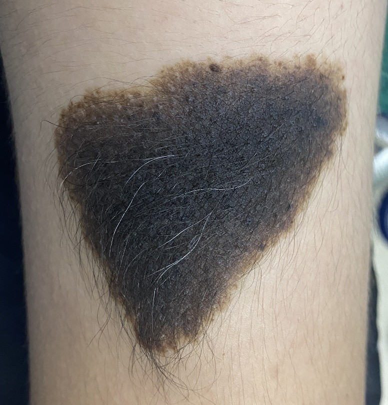 小刘手臂上的黑色“魔鬼”,医学上的正式名称是“先天性黑色素细胞痣”,一般在出生时或出生后两年内出现。临床上分为小型(直径<1.5cm)、中型(直径<20cm)、大型(直径>20cm)。但是这个大小是相对成人而言的。直径20cm的皮损在成人中相当于1%体表面积,在儿童中则相当于5-10%体表面积;直径1.5cm的皮损在成人中相当于一个拇指指甲盖大小,但在儿童中相当于一个巴掌大小。因此,目前国内的学者将先天性黑素细胞痣的分型重新定义:
