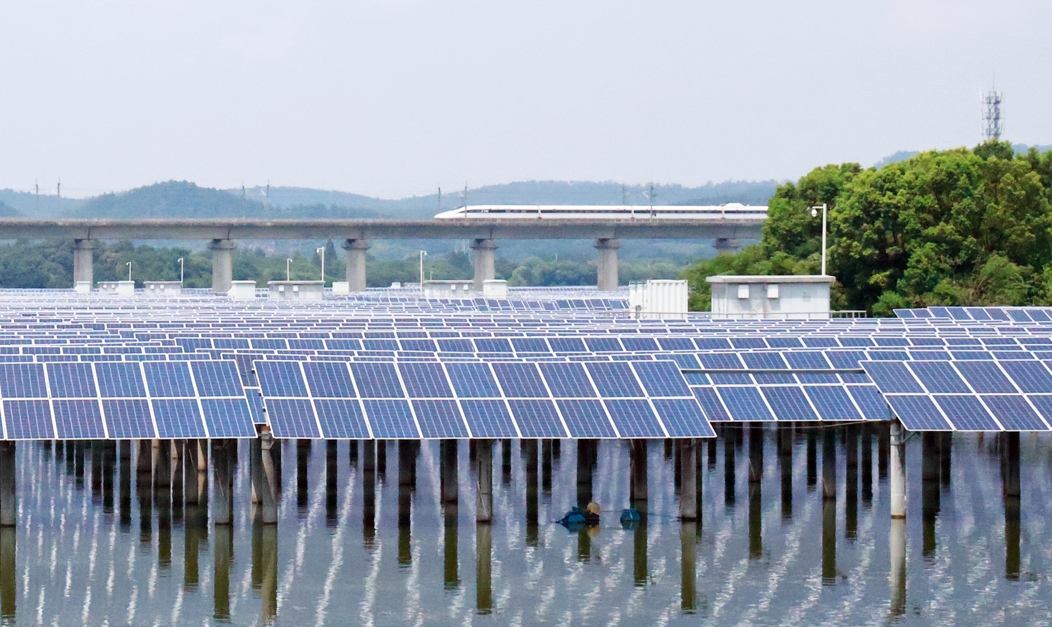 在丽水市莲都区连绵起伏的群山之间,一排排光伏蓝海漫坡越野,层层叠叠沿着公路蜿蜒深入;在湖州长兴县和平镇,昔日满目疮痍的废弃矿山身披“蓝色铠甲”,在阳光下熠熠生辉,板下牧草青青;在安吉县梅溪镇草荡湖水库水域,一列列高铁在光伏矩阵织起的绿网中穿湖而过,形成一道亮丽的风景线……这些与自然和谐共生的场景,正是国家电投践行“绿水青山就是金山银山”理念的生动注脚。