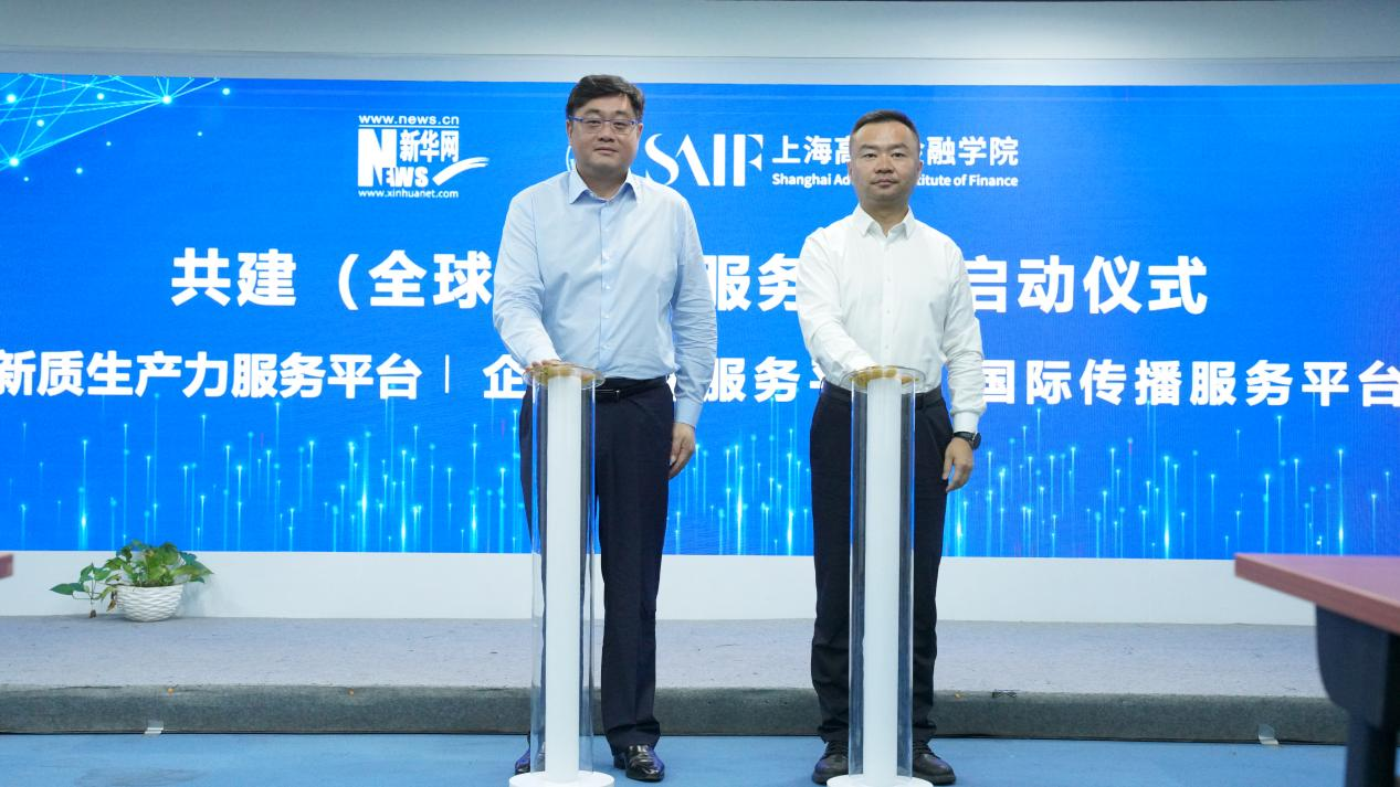 新华网副总裁张芮宁、上海交通大学上海高级金融学院副院长罗譞启动共建(全球)海外服务平台。新华网 王小骥摄