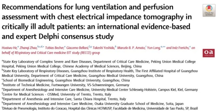 近日,北京协和医院重症医学科何怀武副主任、隆云主任联合广州医科大学生物医学工程学院招展奇教授牵头组织编写了全球首部基于循证证据的肺部电阻抗断层成像成人重症应用国际专家共识。该共识为全球肺部电阻抗断层成像(EIT)技术的临床应用提供了重要参考依据和规范。该成果发表在《柳叶刀》子刊EClinicalMedicine(中科院1区,IF:10.52)上。本研究得到了中央高水平医院临床科研专项、科技部重点研发计划项目及国家自然科研学基金等支持。