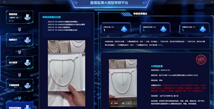 平台运用AI技术,包括OCR识别、语音转写、模糊匹配、内容比对、图片相似度比对等技术,对直播进行全面分析。在当前DeepSeek等大模型在政务领域的大面积应用的背景下,立刻利用新技术对平台进行迭代更新,基于信息库和DeepSeek的结合进行持续训练,开发完善直播监测自动审核功能,实现直播监测视频从采集、切片、转译、分析、审核流程的全自动处理,审核效率提高50%以上。