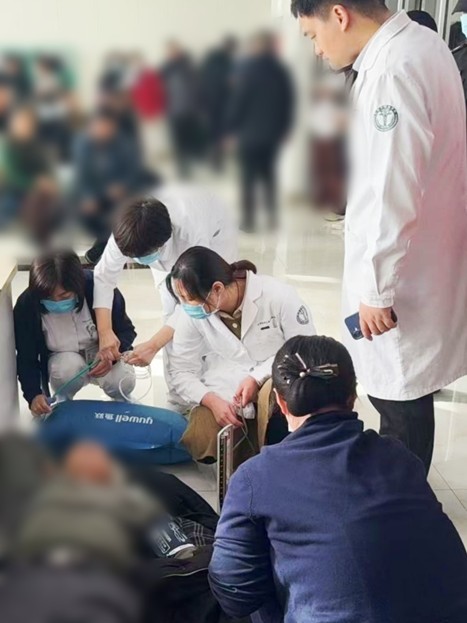 抢救现场争分夺秒、紧张有序。医护人员立即实施心肺复苏、给氧、建立静脉通路,持续进行生命支持。患者恢复自主心跳后,被迅速转入临时抢救室。期间患者出现便意,护士迅速协助清理,全程注重保护其隐私与尊严。整个流程环环相扣、忙而不乱,牢牢把握心搏骤停救援的“黄金窗口”。经过紧张有序的现场抢救,患者生命体征趋于稳定。