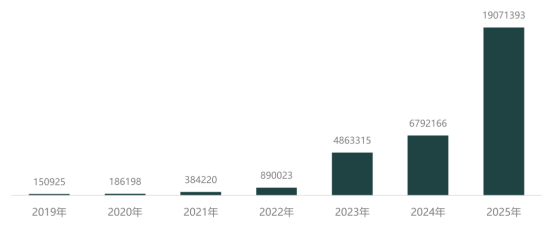 数据容量是指将一个地方平台中可下载的、结构化的、各个时间批次发布的数据集的字段数(列数)乘以条数(行数)后得出的数量,体现的是平台上开放的可下载数据集的数据量和颗粒度。2019年以来,各地平台无条件开放的可下载数据集的容量从2019年的约15亿到2025年超1907亿(如下图所示),六年间增长了126倍,复合年均增长率为124%。