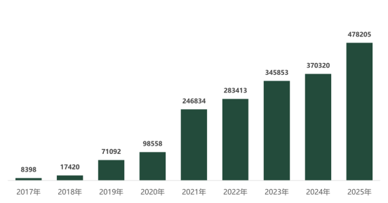 自2017年中国开放数林指数首次发布以来,各地平台上开放的有效数据集总数逐年增长(如下图所示)。2017年全国所有地方只开放了8000多个数据集,2025年已增长到近48万个,是八年前的近57倍,复合年均增长率为66%。